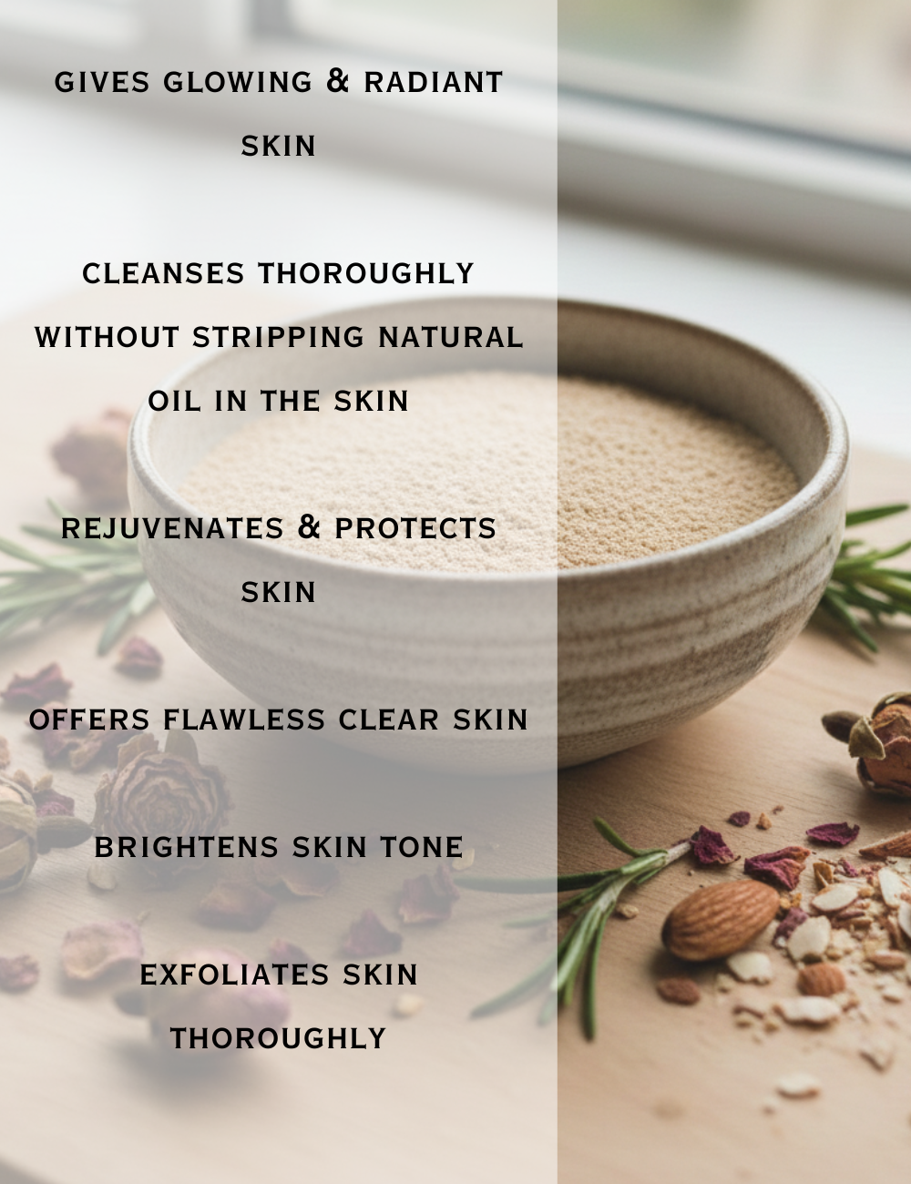 Infused with complexion-enhancing herbs like sandalwood and rose, it revives dull skin and brings out a healthy, luminous glow.